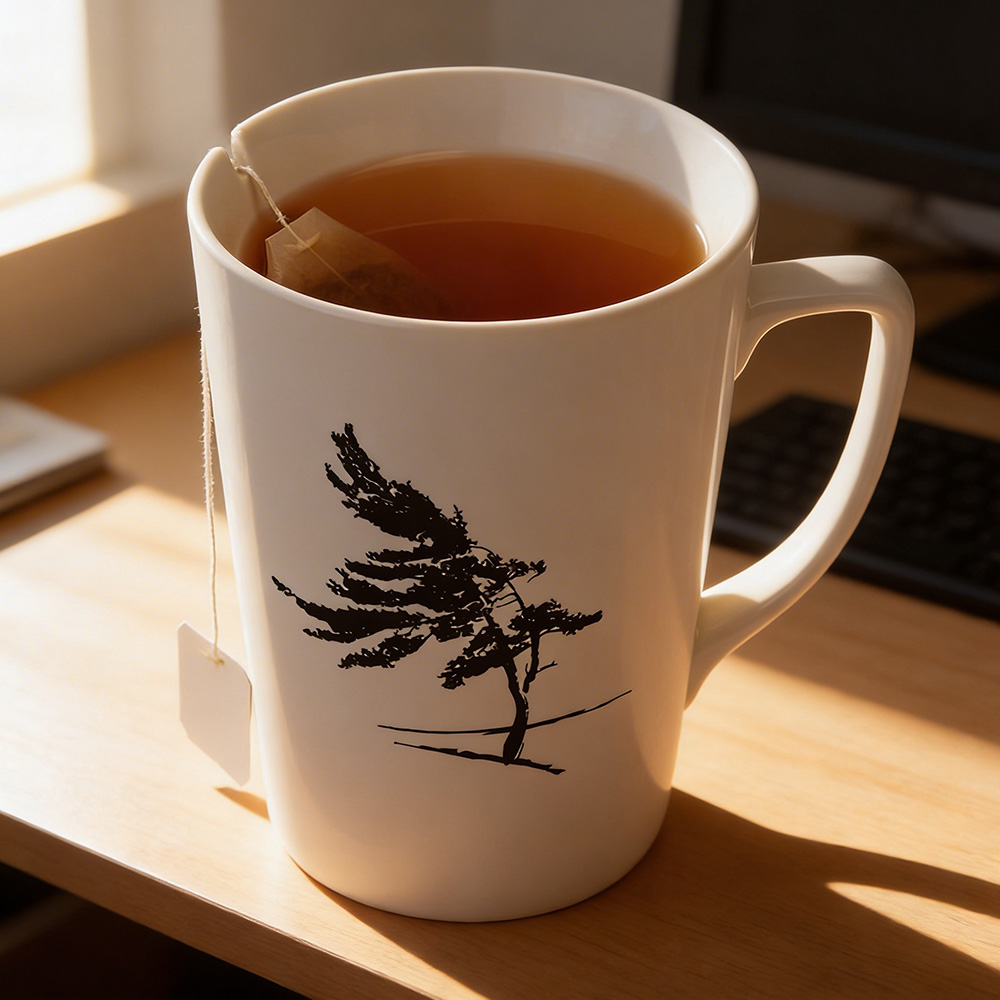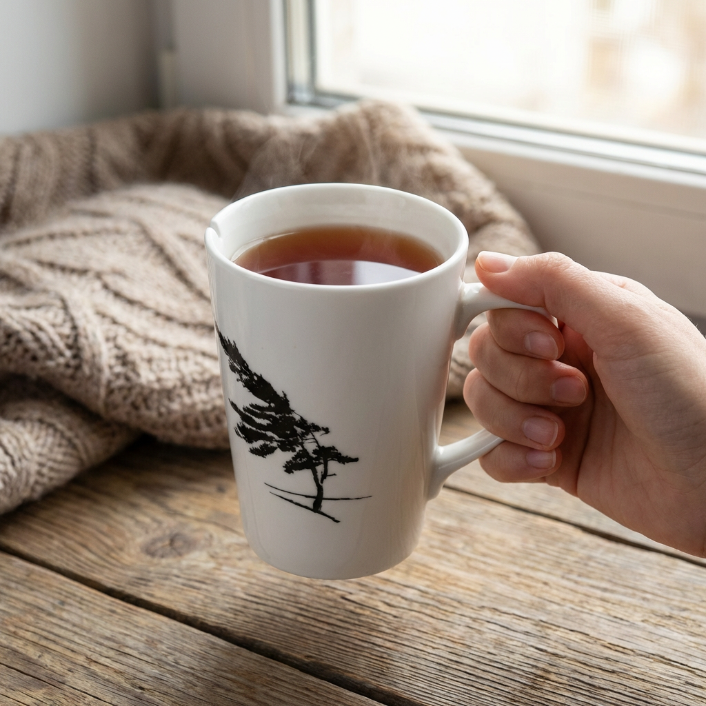 Inspired by resilient coastal trees, the Windswept West print brings calm, minimalist beauty to your daily tea ritual. Cadmium-free, double-fired, and chip-resistant, it includes a clever built-in slot on the rim to hold your tea bag, keeping things neat and cozy. With an 11.8 oz / 350 ml capacity and printing done in Canada, it’s the perfect mug for slow sips and warm moments.
